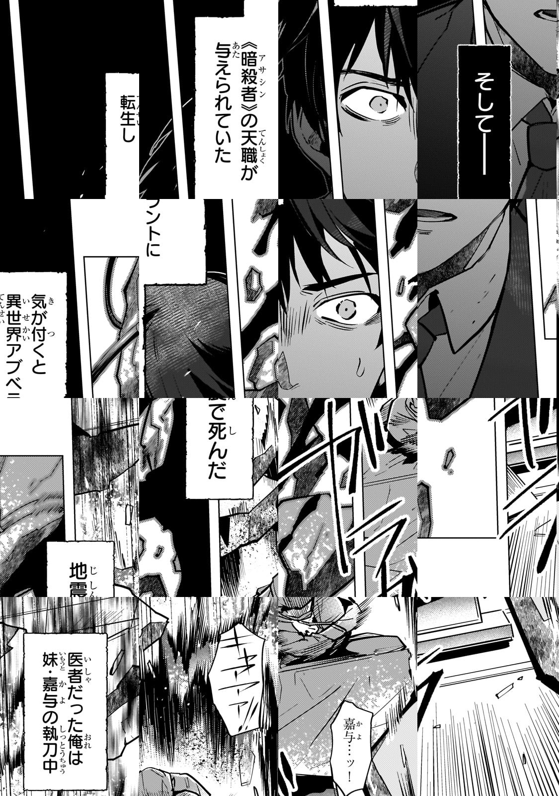 優秀な医者だった荻野知聡は、妹の手術中に地震で命を失ってしまう。しかし、気づくと異世界に転生し、あろうことか人を殺す能力に特化した『暗殺者』の天職を与えられていた。妹と生き別れてしまったこと、そして自身の天職に苦悩する中、目の前に妹と瓜二つの少女が現れ――!? 『復讐屋』を生業に生きる元・医者が、様々な事件に巻き込まれていく異世界ファンタジーサスペンス。