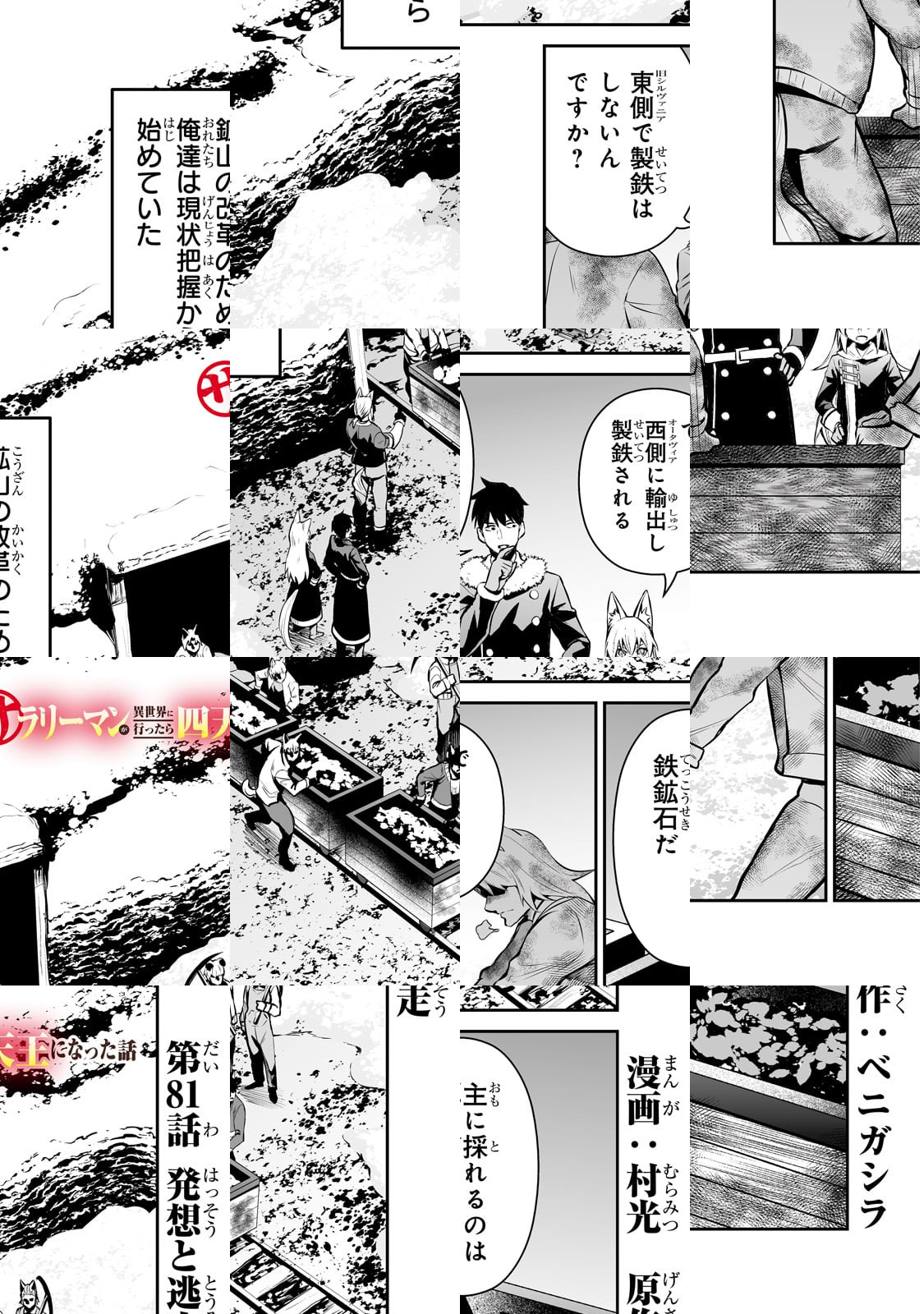 私、ベニガシラはサラリーマンしながら漫画家をしているんですが、まさかサラリーマンが主人公の漫画を描くとは思いませ んでした。チートスキルも、最強武器も持っていない、ただの サラリーマンが異世界で活躍するこのマンガ、楽しんでいただ けると幸いです。