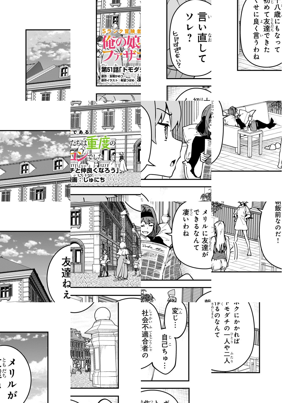 みなさんはじめまして、しゅにちです。 人生初の連載で漫画の面白さと難しさを満喫中でございます。 この『Sランク冒険者である俺の娘たちは重度のファザコンでした』のヒロインである、エルザ、アンナ、メリル。文章からにじみ出るかわいさにこれから連載していくにあたってたくさん描けると思うと心おどります。 自分が出せる実力を最大出力してこの作品の魅力を出せたらなと思います。 何卒よろしくお願いいたします。