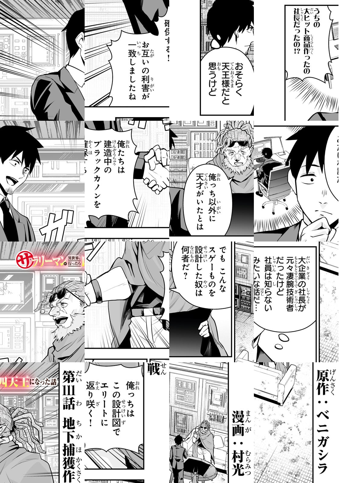 私、ベニガシラはサラリーマンしながら漫画家をしているんですが、まさかサラリーマンが主人公の漫画を描くとは思いませ んでした。チートスキルも、最強武器も持っていない、ただの サラリーマンが異世界で活躍するこのマンガ、楽しんでいただ けると幸いです。