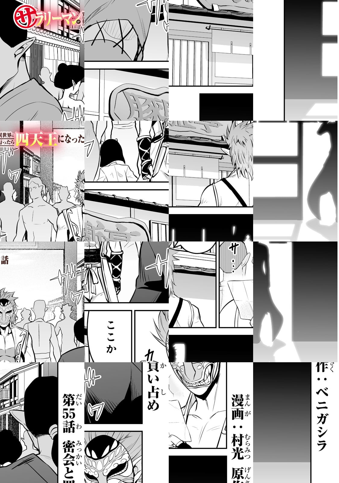 私、ベニガシラはサラリーマンしながら漫画家をしているんですが、まさかサラリーマンが主人公の漫画を描くとは思いませ んでした。チートスキルも、最強武器も持っていない、ただの サラリーマンが異世界で活躍するこのマンガ、楽しんでいただ けると幸いです。