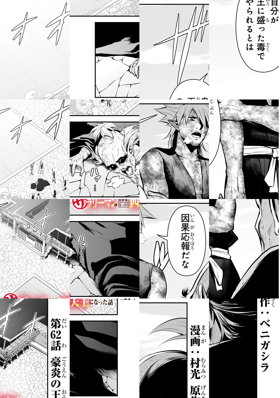 私、ベニガシラはサラリーマンしながら漫画家をしているんですが、まさかサラリーマンが主人公の漫画を描くとは思いませ んでした。チートスキルも、最強武器も持っていない、ただの サラリーマンが異世界で活躍するこのマンガ、楽しんでいただ けると幸いです。